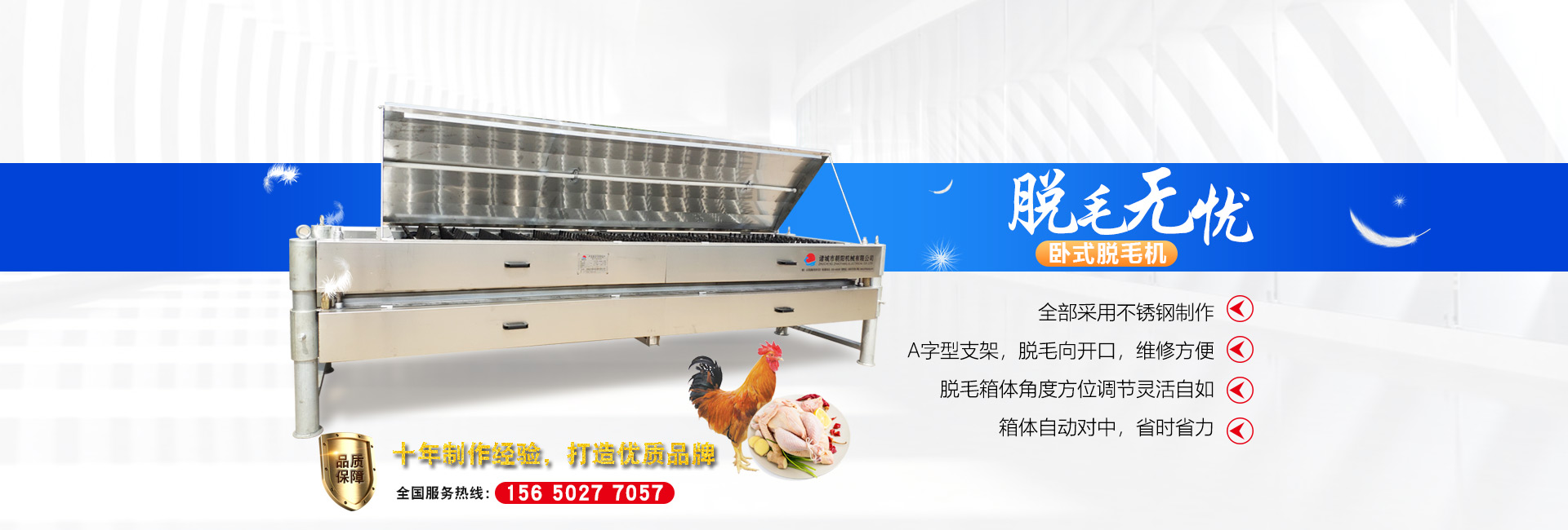 公司長期與國內外屠宰加工企業合作,走引進——消化——創新和自主研發相結合的道路,在國內外同類產品的基礎上,不斷更新和改造。公司主要設備有:A字型立式脫毛機、臥式脫毛機、強力噴淋機、松毛機、浸燙池、螺旋預冷機、禽籠清洗機、電暈機、兔扯皮機、兔割前爪/后爪機、剝胗機、自動洗鉤機、螺旋燙爪機、雞爪脫皮機、分割輸送帶等屠宰用設備。其中,公司獨力發明生產設計的“電動調節脫毛機”及“自動控水控溫浸燙池”順利通過知識產權局的實質性審查。公司所生產的設備 可與國外同類產品配套使用,設備遠銷阿爾及利亞、澳大利亞等中東、非州等并建立了長期穩定的合作關系。